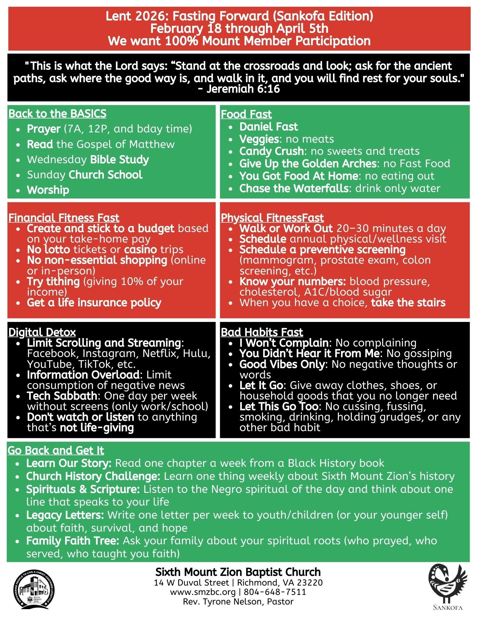 Lent begins on Ash Wednesday, February 18th. Each year, we prayerfully consider what we can sacrifice we can offer to God as we prepare for Resurrection Sunday. We present several options for members to consider. You may pick one sacrifice from one category or some choose to do one thing from each category. You DO NOT have to do it all, but we ask that you DO something. Seek God about what your Lenten journey should be.